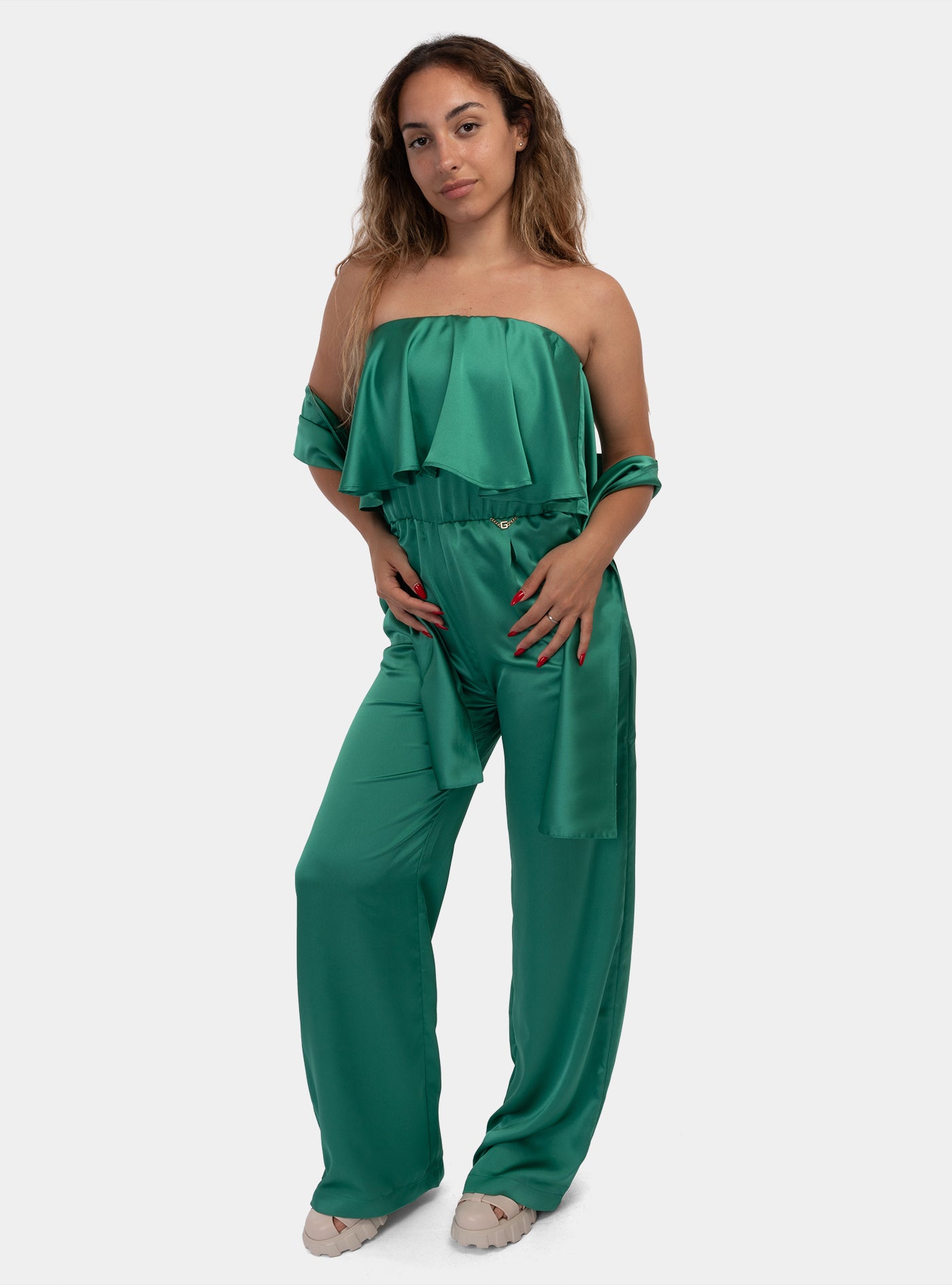 Green Satin Strapless Jumpsuit